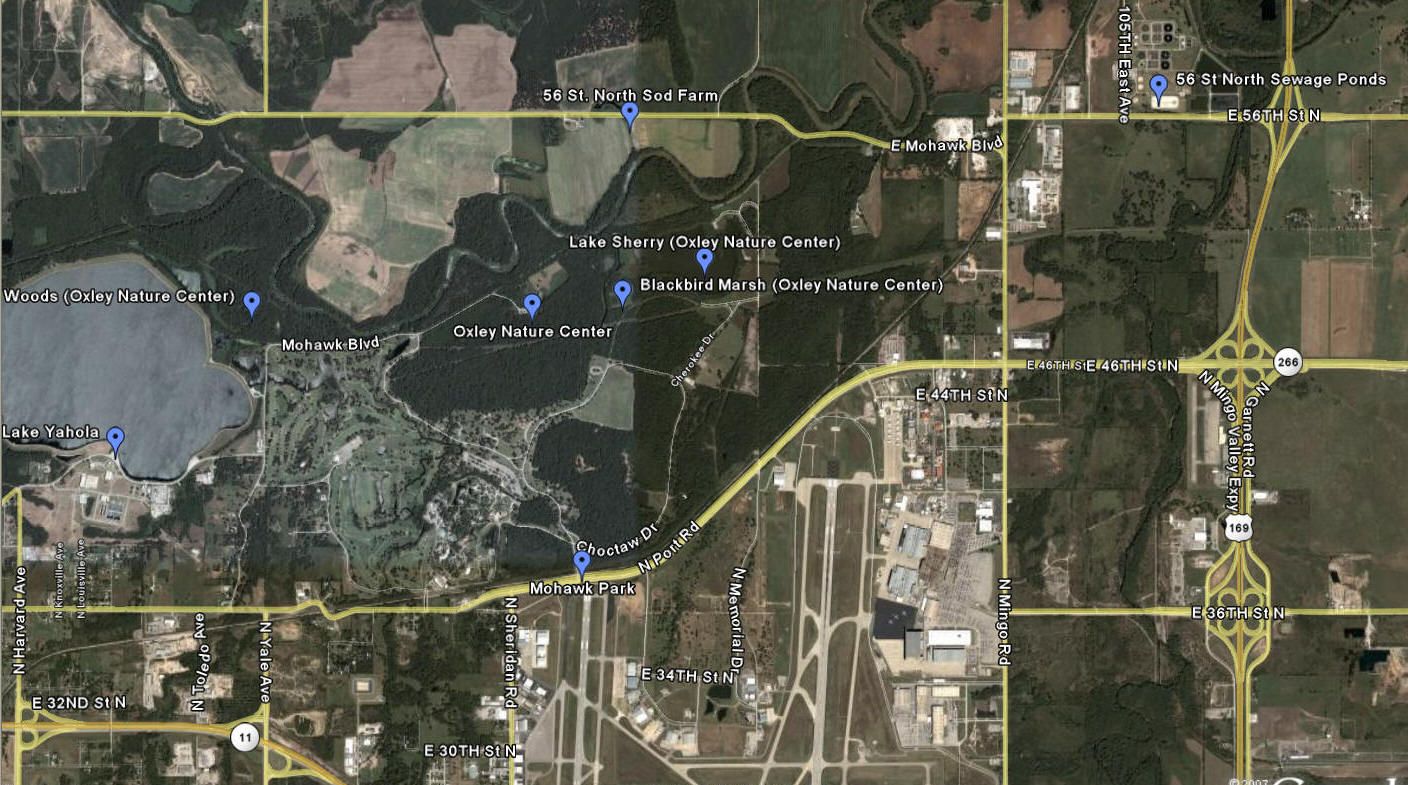 The sod farms start at Memorial and 56th Street North and go west from there. The best spot is 2.3 miles west of Mingo or 2 miles East of Hwy75 on the south side of 56th St North. There is a place to pull off on both sides of the road. A wooded pond right on 56th street marks the westernmost point of the sod farms.
