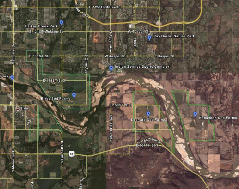 The Bixby and Leonard and other area sod farms, which are periodically irrigated or flooded by over-night rains, bringing down great numbers of shorebirds in spring and fall migration. Notable species are Blackbellied Plover, Whimbrel, Hudsonian and Marbled godwits, Sanderlings, Dunlin, phalaropes, peeps, and occasionally large numbers of Buff-breasted Sandpipers.