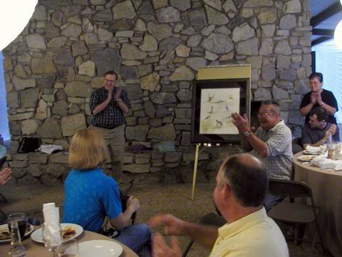 You may know that before he died, Bob donated to NAI several guitars, several of his birding vests, and a pair of binoculars and requested that they be auctioned at our annual scholarship auction to raise money for this important program about which he felt so strongly. His good friend and our executive director, Tim Merriman, did the honors of auctioning the instruments and vests and each time spoke of Bob and his contributions over the years. The items brought tears, cheers, and a lot of money!